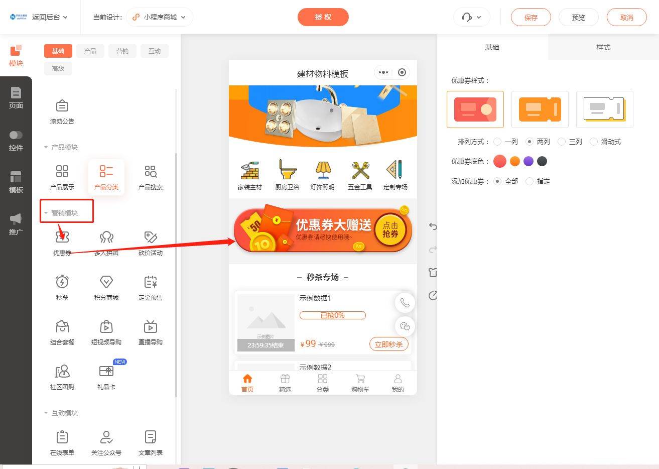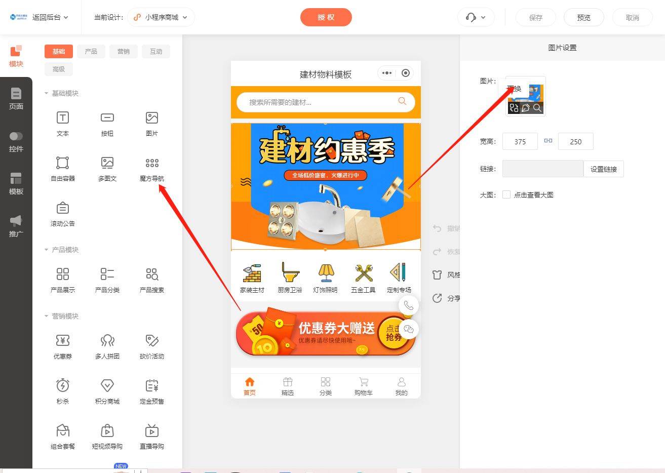 点击即可进行编纂,起头搭建小法式商城。能够再次进行调整和点窜,需要按照建材行业的需乞降特点进行响应的调整和点窜,找到并点击【商城】中的【去办理】,